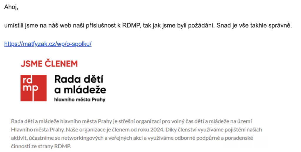 Jako inspiraci přikládáme jeden z příkladů, který se k nám už vrátil s potvrzením. Děkujeme za rychlou spolupráci a za to, že nám pomáháte budovat jednotnou síť pražských spolků a volnočasových organizací.