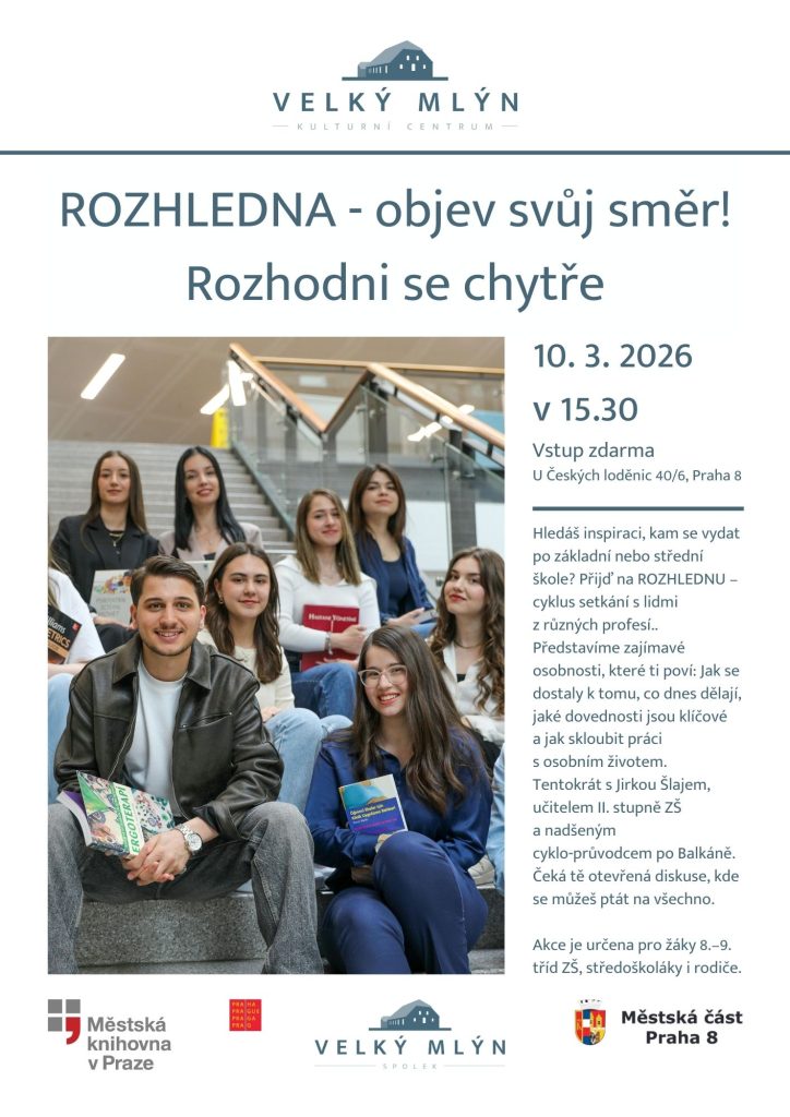 Pozvánka na akci Rozhledna, která proběhne 10. 3. od 15.30 ve Velkém mlýně a je určená žákům 8. a 9. ročníků ZŠ a studentům SŠ je pořádána ze strany Městské knihovny.